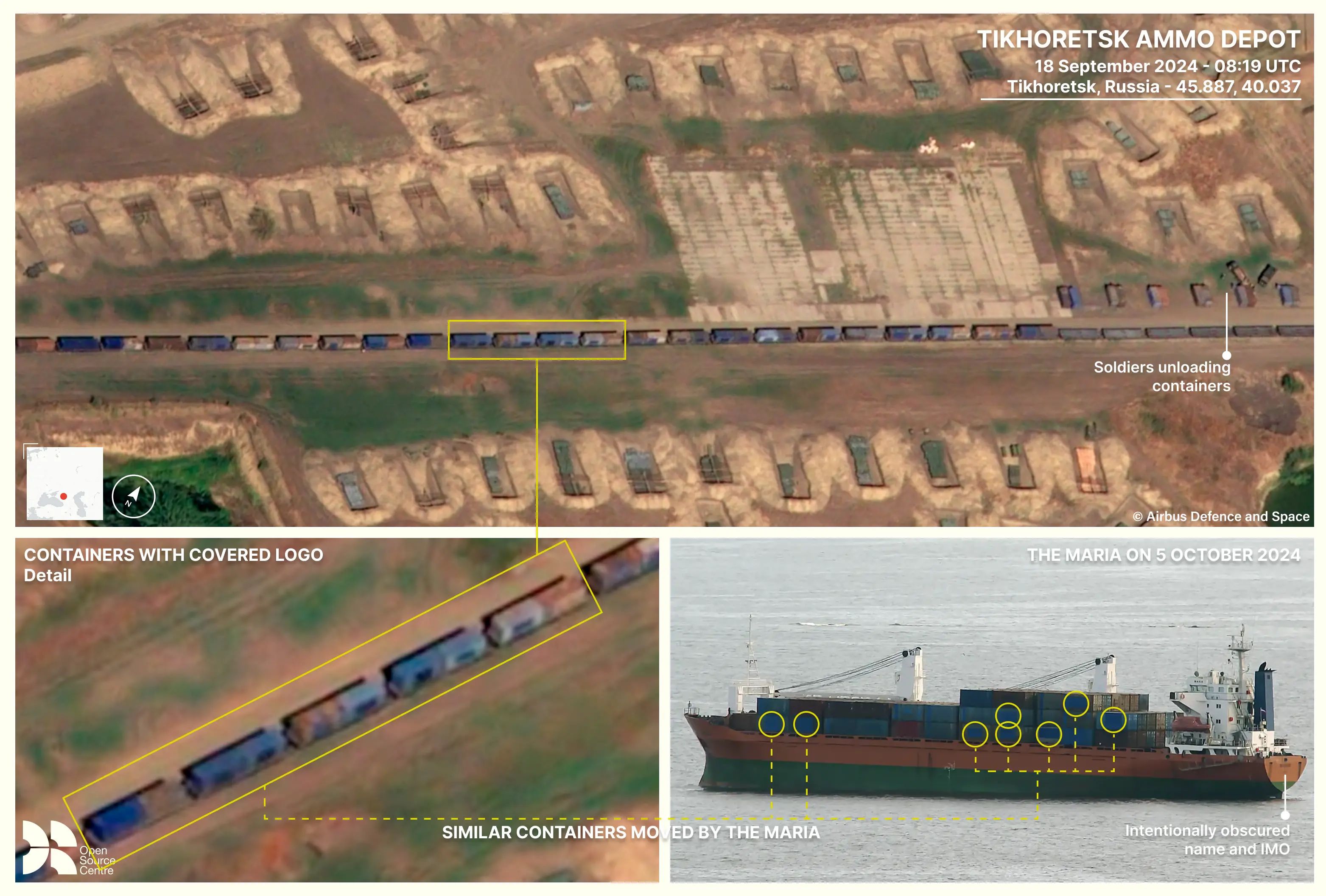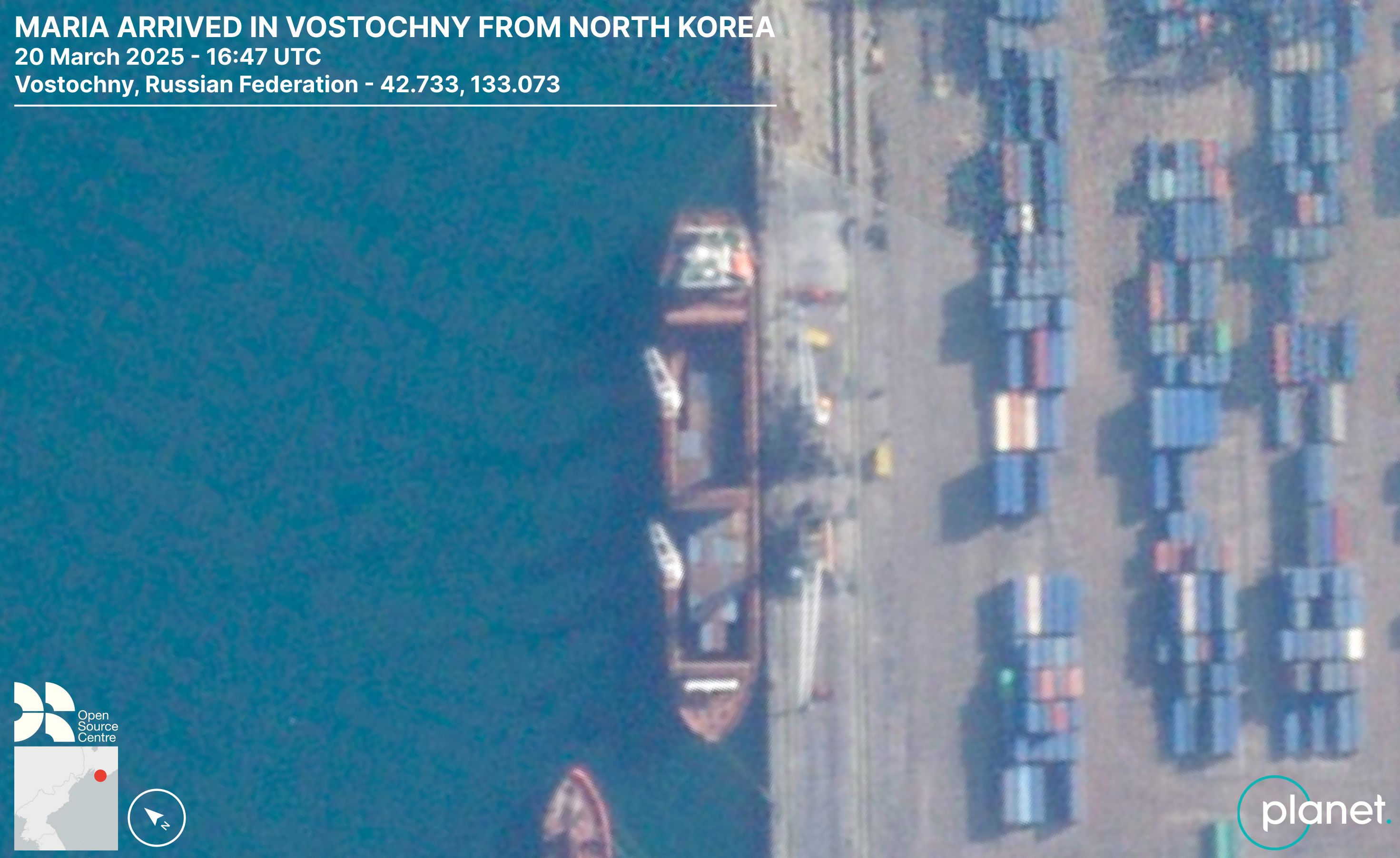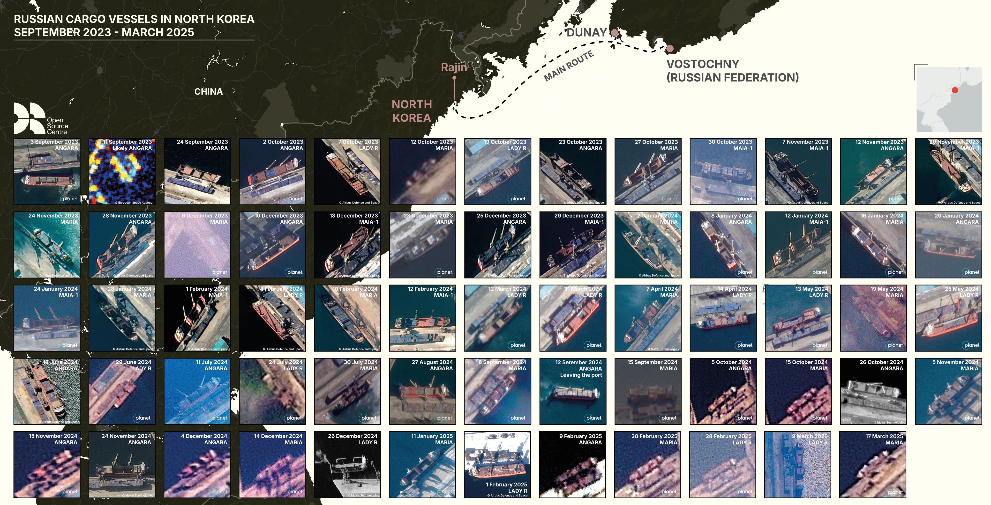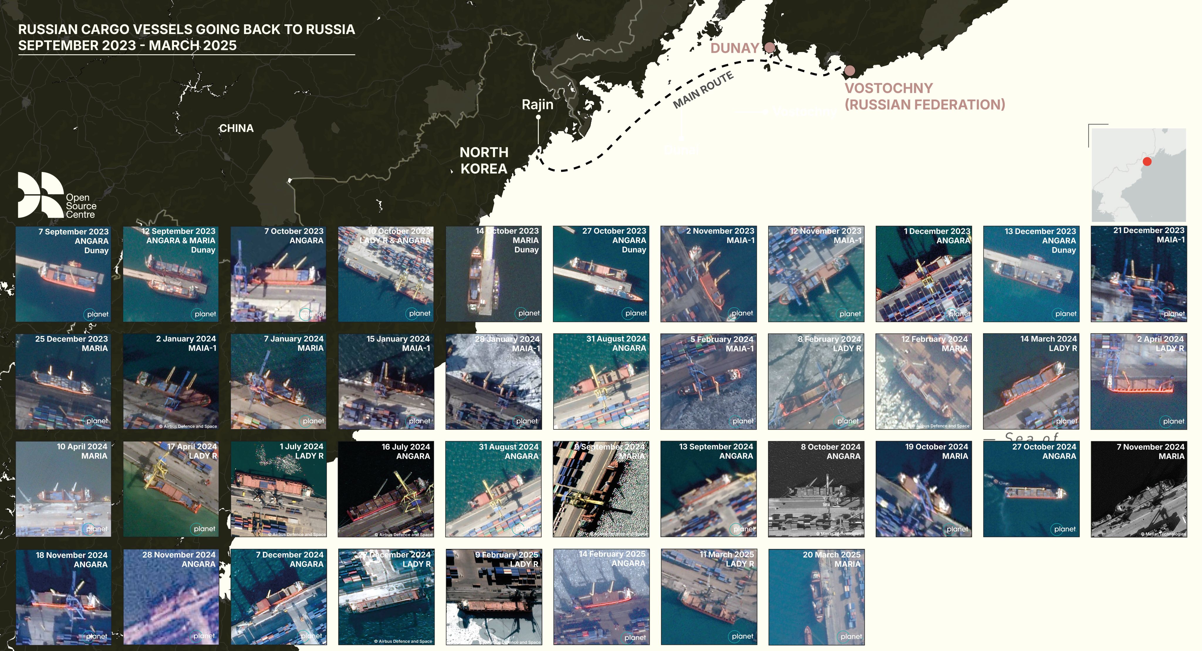 Since September 2023, four Russian-flagged cargo vessels named the Angara (IMO 9179842), Lady R (IMO 9161003), Maria (IMO 8517839) and Maia-1 (IMO 9358010) have been moving containers filled with North Korean munitions to Russia. A meticulous analysis of hundreds of satellite images by the Open Source Centre has documented a minimum of 64 voyages between the North Korean port of Rajin and Russia's far eastern ports.