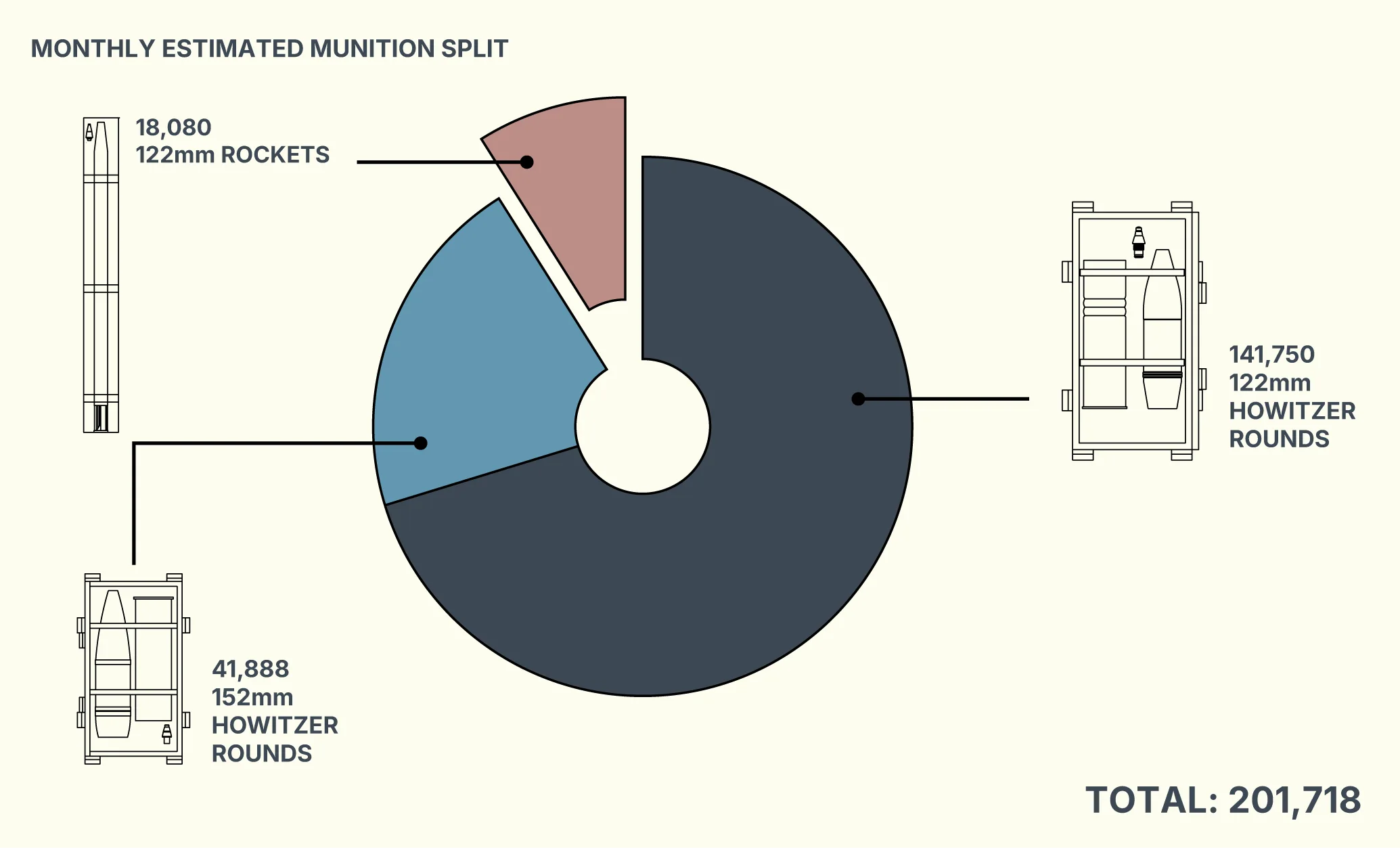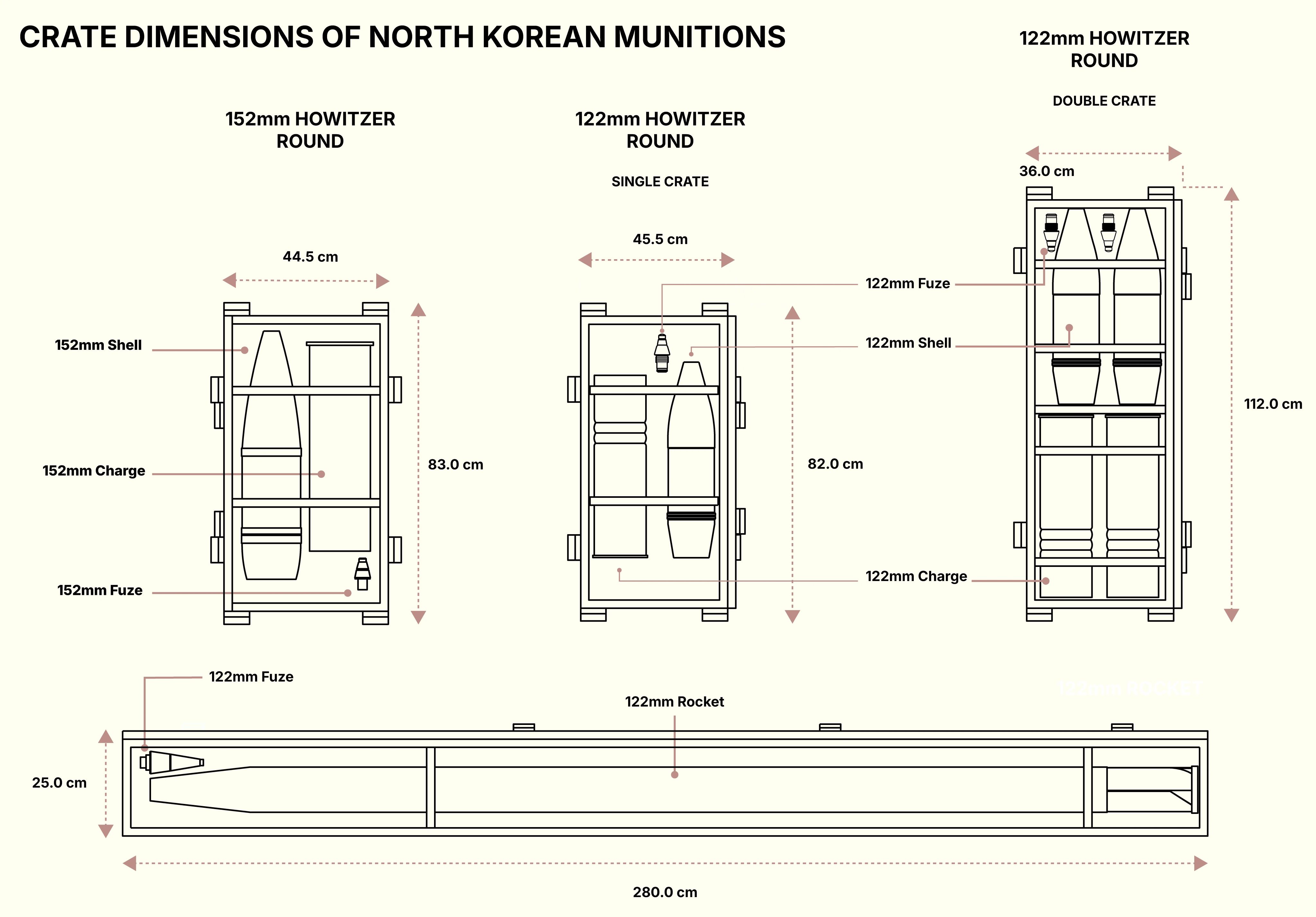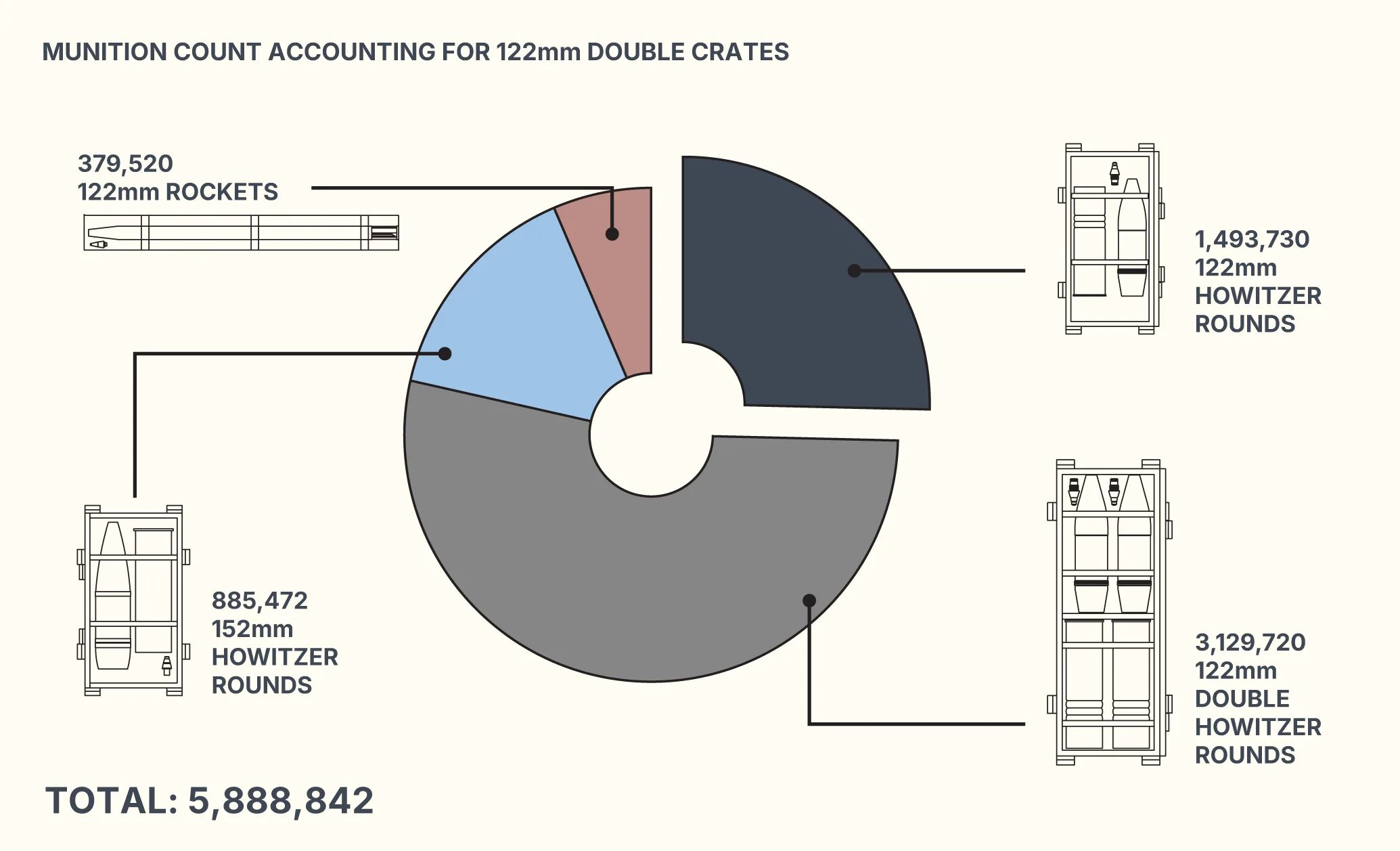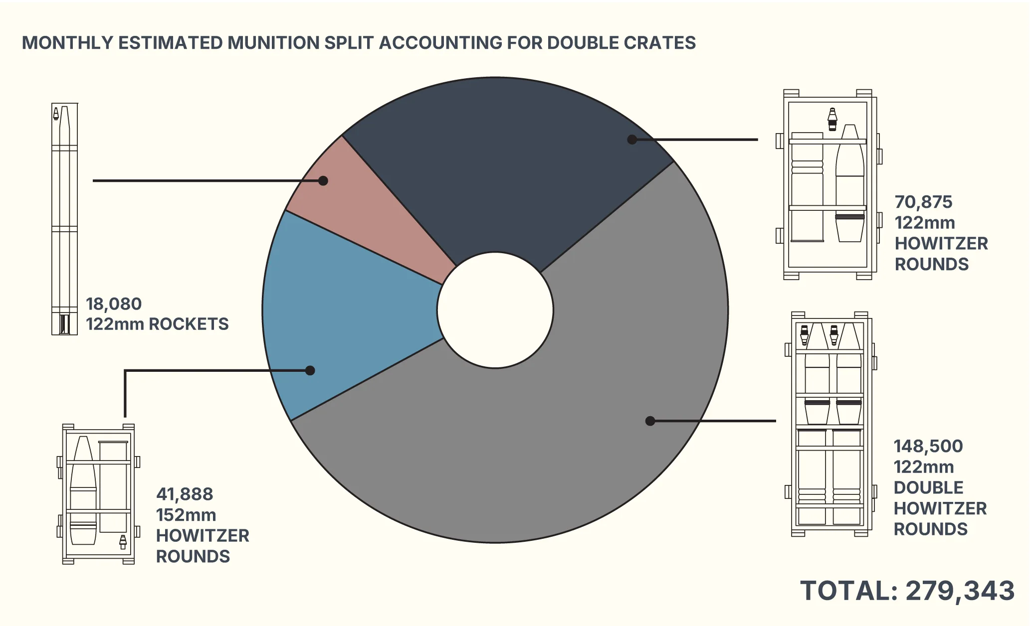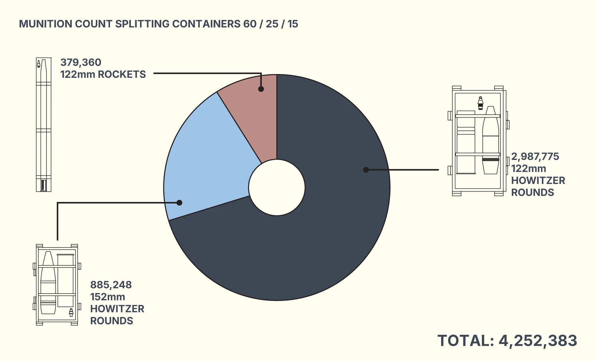 To help estimate the total volume of munitions in these containers, OSC used an official Ukrainian percentage breakdown of North Korean munitions deliveries reviewed by Reuters. These assessments stated the split between North Korean munitions types was likely 60% 122 mm howitzer rounds, 25% 152 mm howitzer rounds and 15% 122 mm rockets.