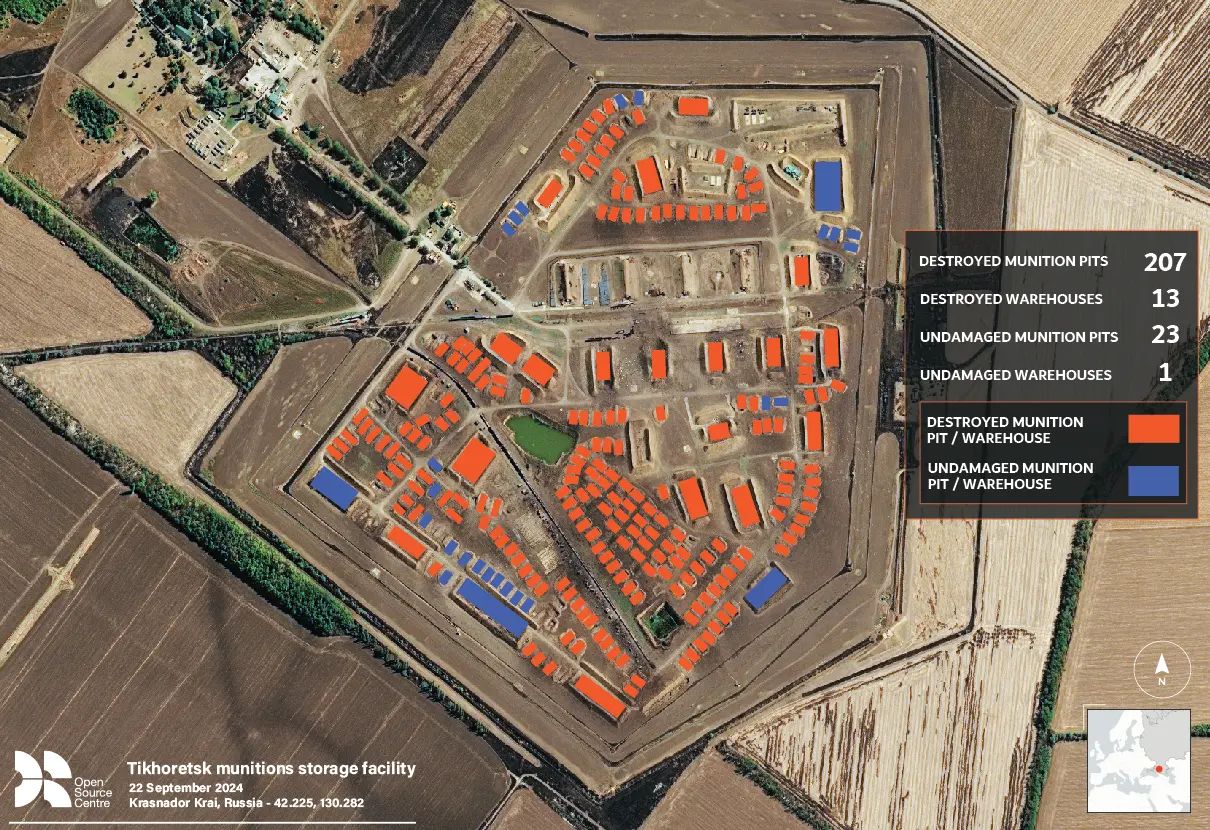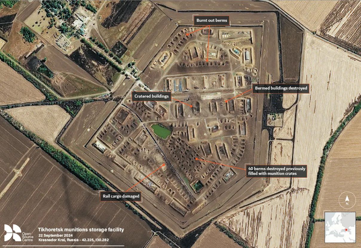 In September 2024, several of these facilities were attacked by Ukrainian drone strikes. The importance of these munition deliveries made them a high value target, and significant parts of the facilities at Toropets and Tikhoretsk were destroyed. Reports indicated these strikes may have cut Russia's artillery rates by up to half, once again underlining the strategic value of ammunition arriving at these depots.