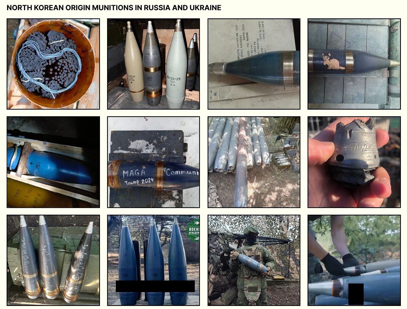 The first reports of Russian forces using North Korean munitions at scale began to appear on social media in November 2023, three months after deliveries started from the North Korean port of Rajin. The posts on Telegram and X contained images of North Korean manufactured 122 mm, 152 mm, and 122 mm rockets - in addition to a number of other munitions.