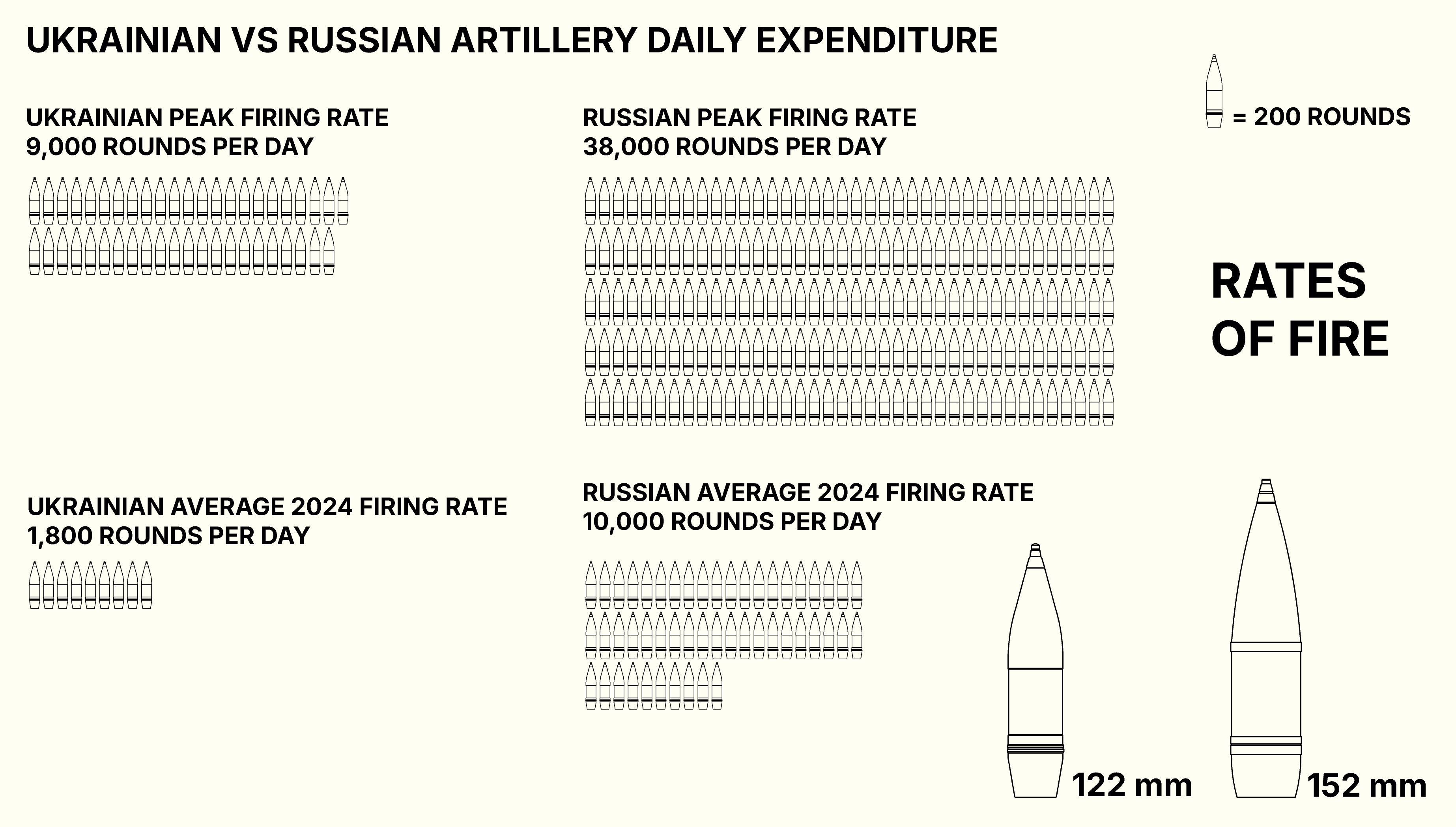 During the early months of Russia’s 2022 invasion of Ukraine, Russia’s daily expenditure of artillery rounds reportedly reached a high point of 38,000 rounds per day. Some estimates, such as those made by the Estonian Government, put this number even higher at 60,000 during the spring of 2022. Following this peak, however, the daily rate of fire stabilised, ranging between 7,000 and 16,000 rounds, but averaging around 10,000 rounds per day.