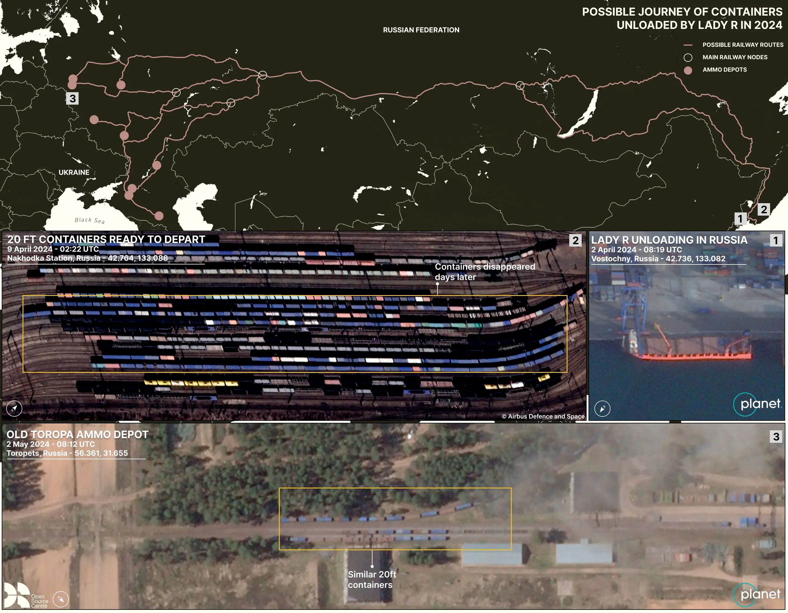Satellite imagery of depots at Tikhoretsk, Mozdok, Toropets, Kirzhach and Karachev all show twenty-foot containers arriving at the facilities in late 2023 and throughout 2024. Exclusive documents provided by Reuters detail North Korean munitions being delivered to specific units in Mozdok and Toropets in April and May 2024, with satellite imagery showing blue containers arriving in the same month, and then throughout the year.