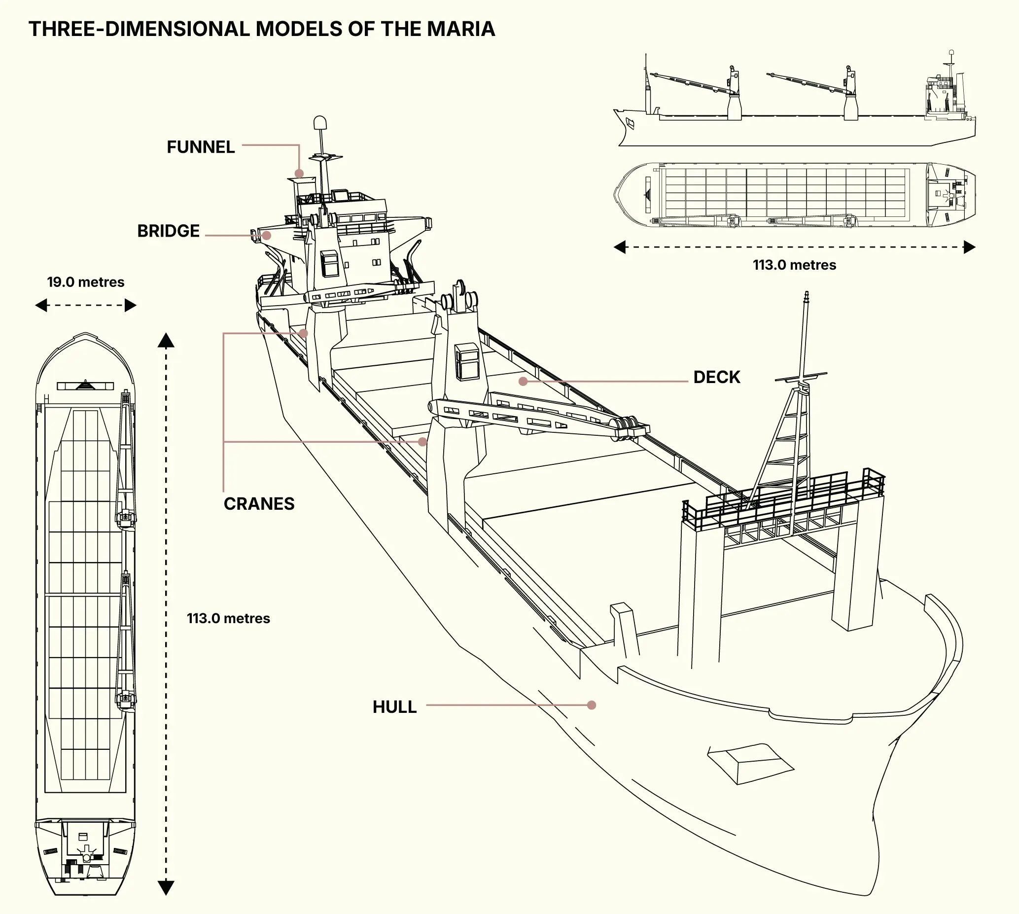 These crates and munitions were measured and modelled in three dimensions, and then stacked into modelled containers. This allowed us to estimate, with a high degree of accuracy, the volumes of different munitions that the Angara, Lady R, Maria and Maia-1 could have moved in each container over these 64 journeys.
