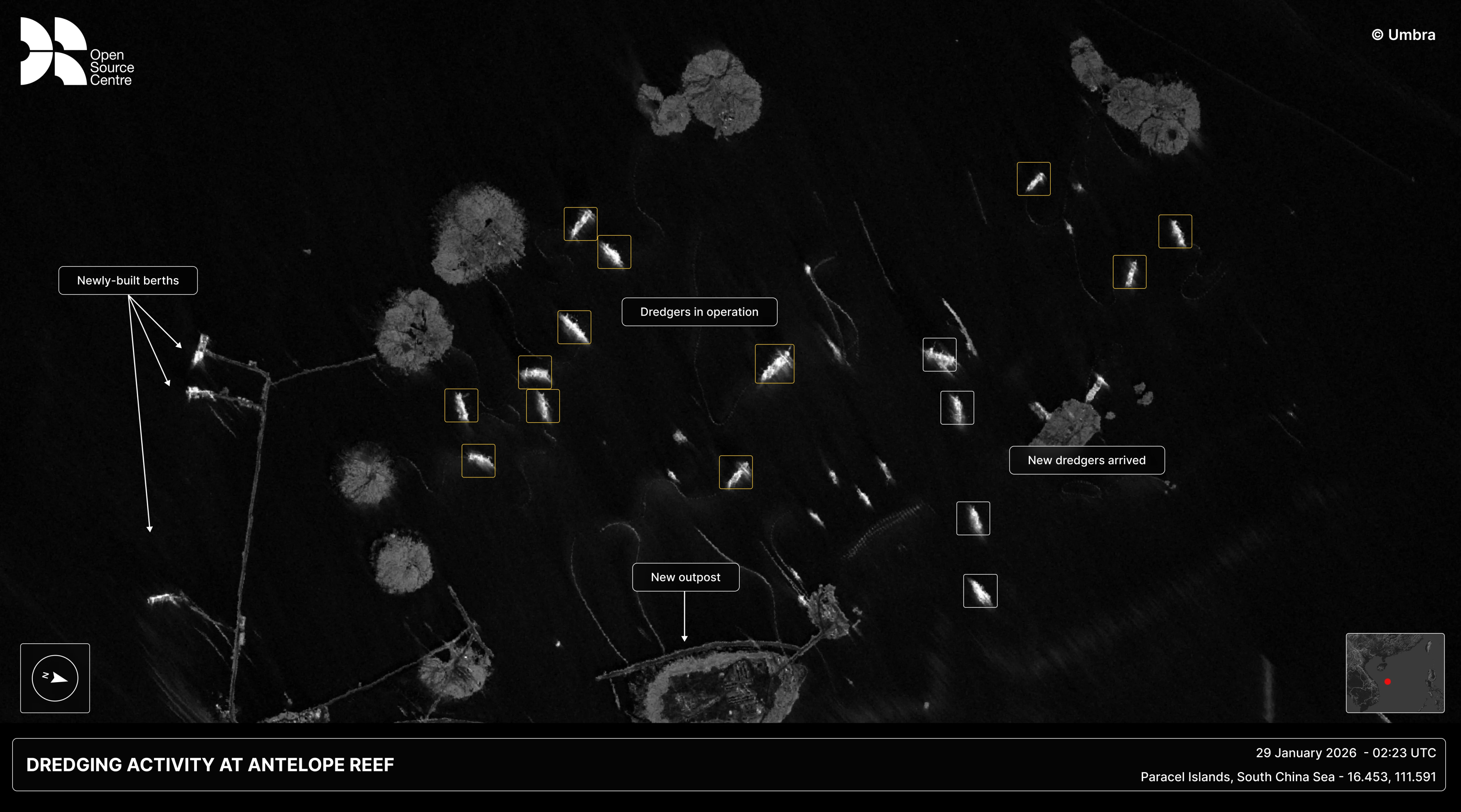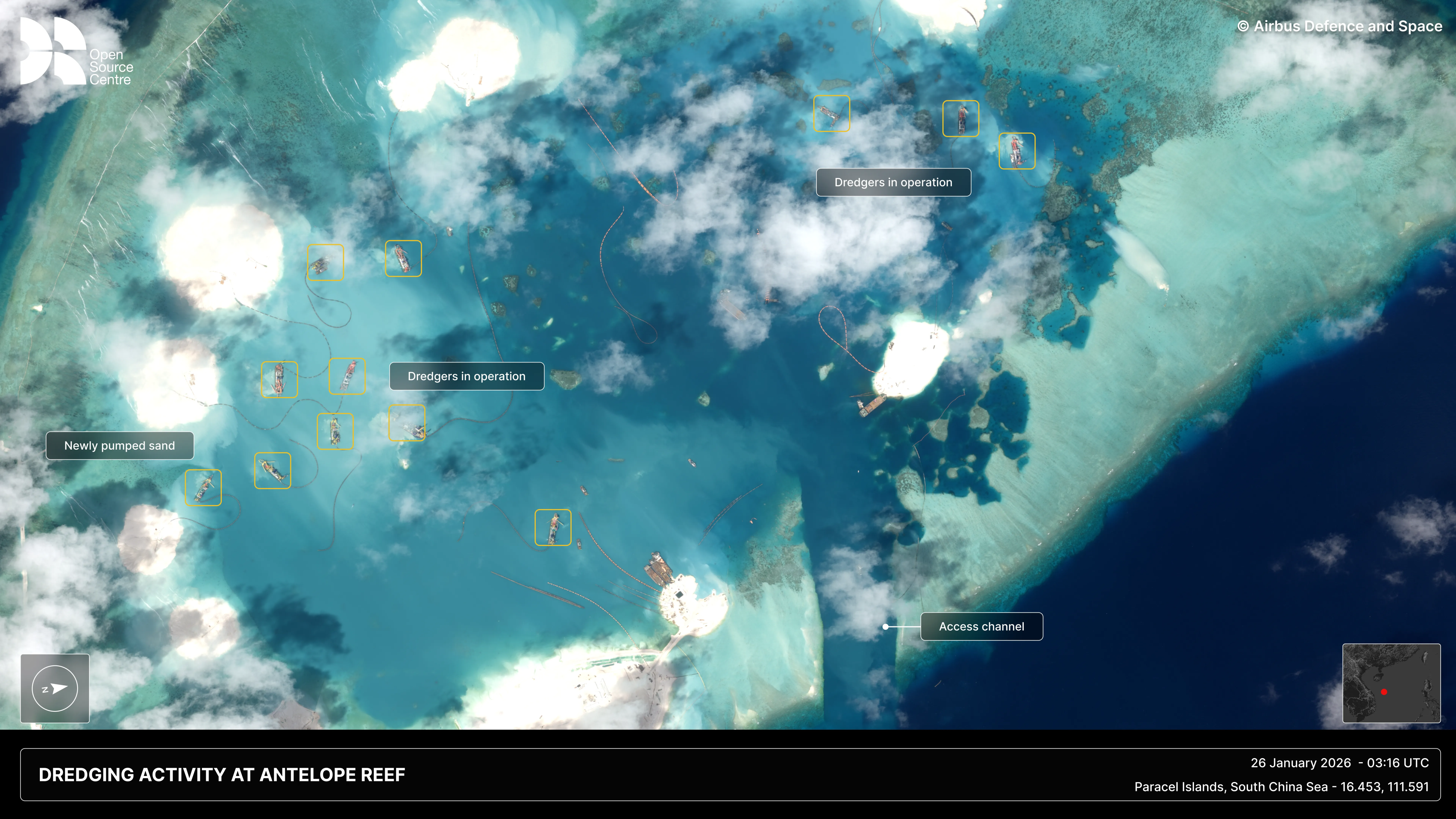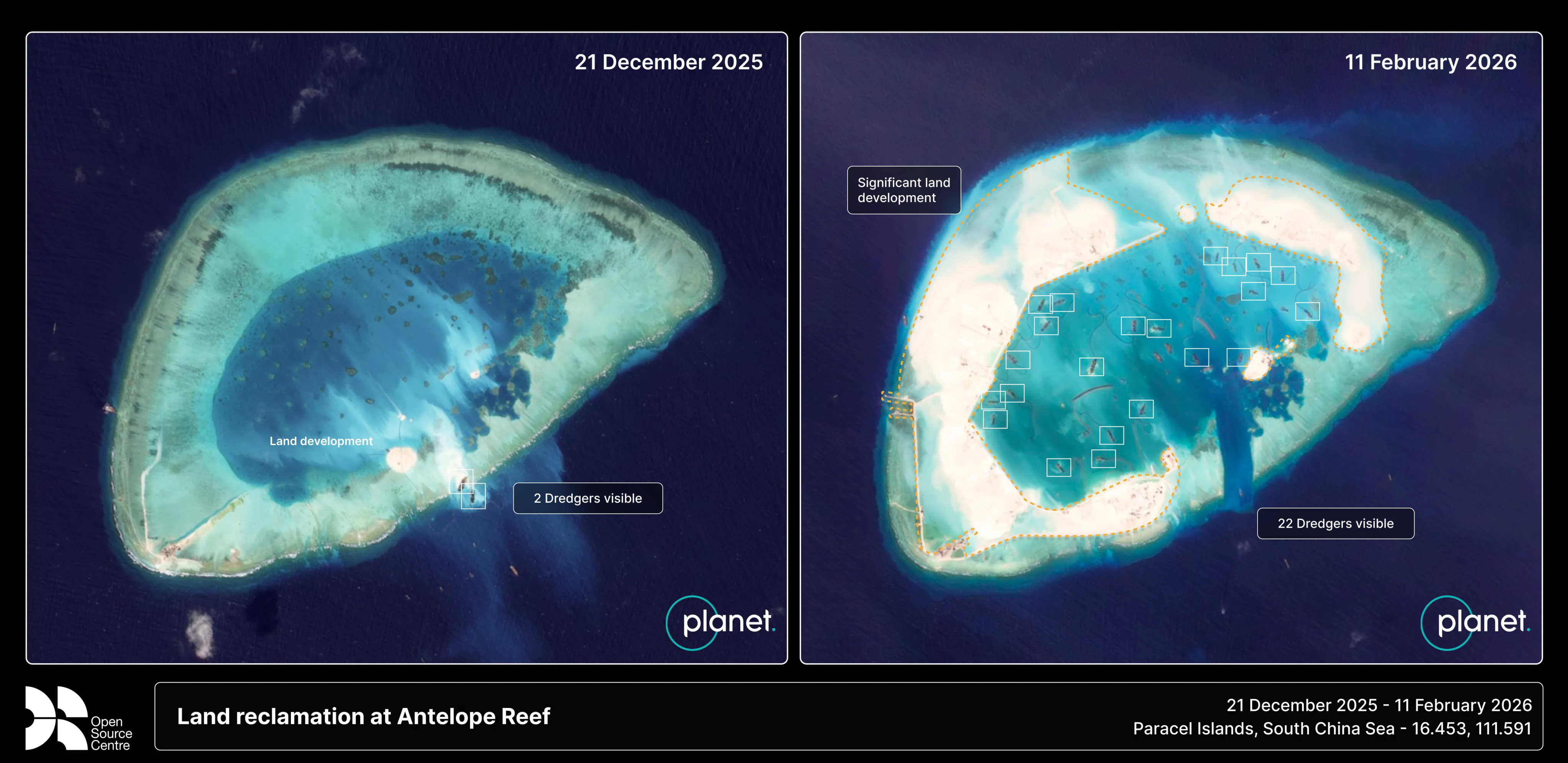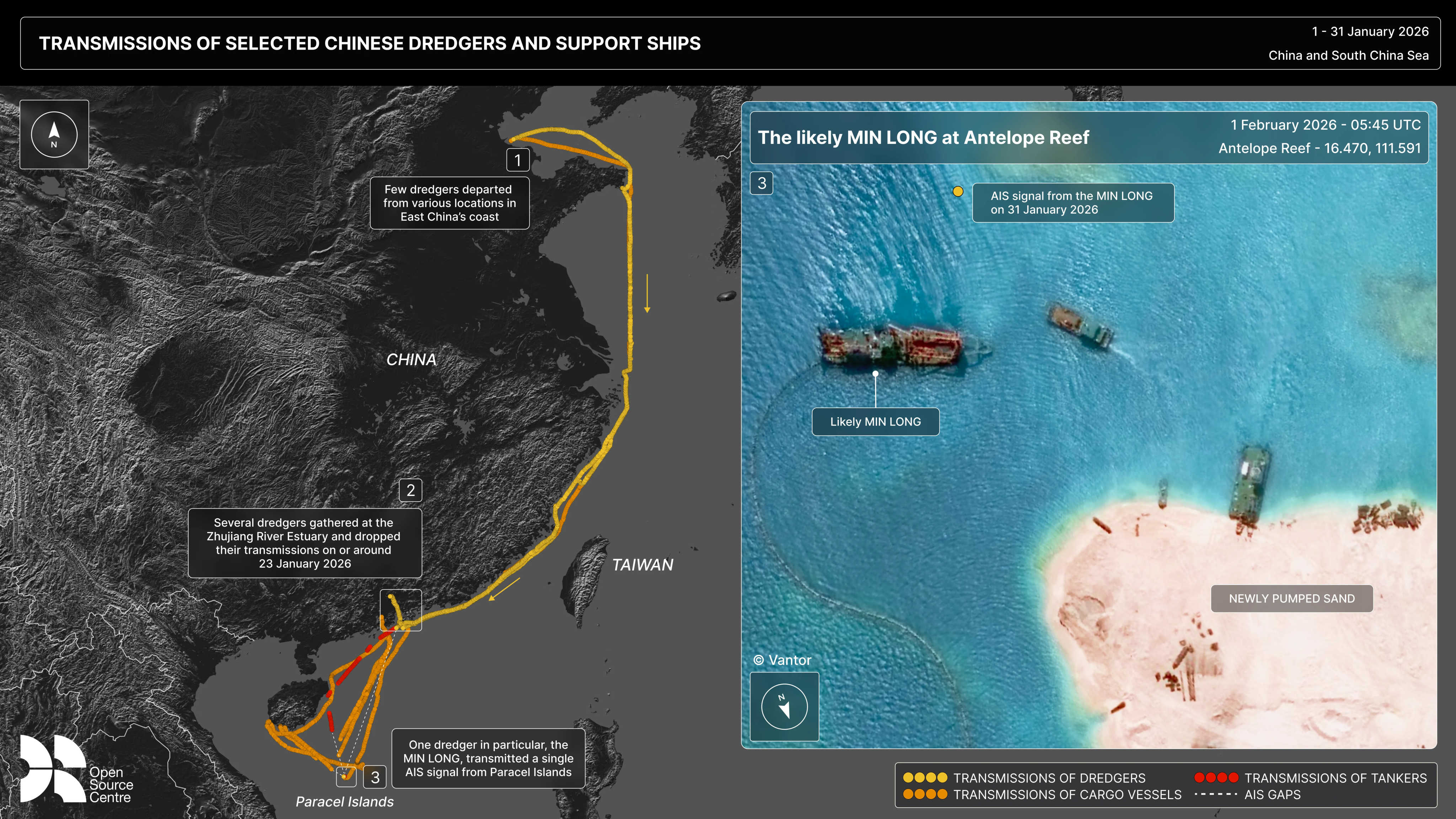 One vessel observed at Antelope Reef in 2026 is the Min Long (MMSI: 412472970), a China-flagged dredger which sailed from Shenzhen to the South China Sea in January 2026, transmitting only once at Antelope Reef on 31 January 2026, according to data from Starboard Maritime Intelligence. While the Min Long is the only dredger that has transmitted in the area over the last three months, satellite imagery now shows dozens of vessels in the area, underscoring the pace and scale of these operations.