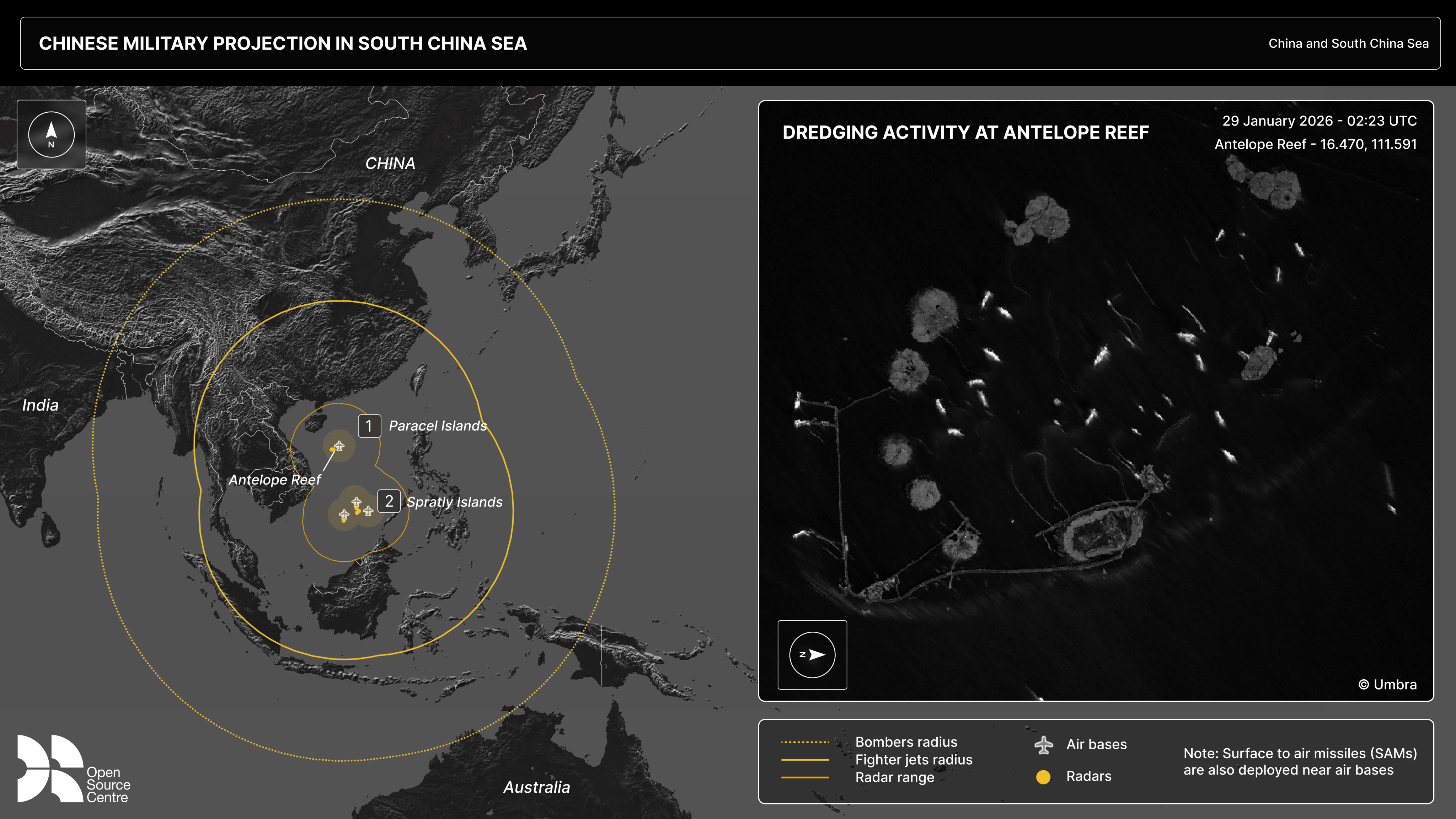 Dozens of satellite images taken in recent weeks over Antelope Reef and analysed by the Open Source Centre reveal that China has rapidly accelerated land-reclamation efforts across this isolated atoll in the Paracel Islands, a critical foothold seized from Vietnam in 1974. While the archipelago’s administrative centre at Woody Island has long hosted military aircraft including China’s J-11 fighter jets and KJ-500 surveillance aircraft, Antelope Reef had remained an undeveloped shoal with a diverse ecosystem of corals and marine fauna. That is, until now.