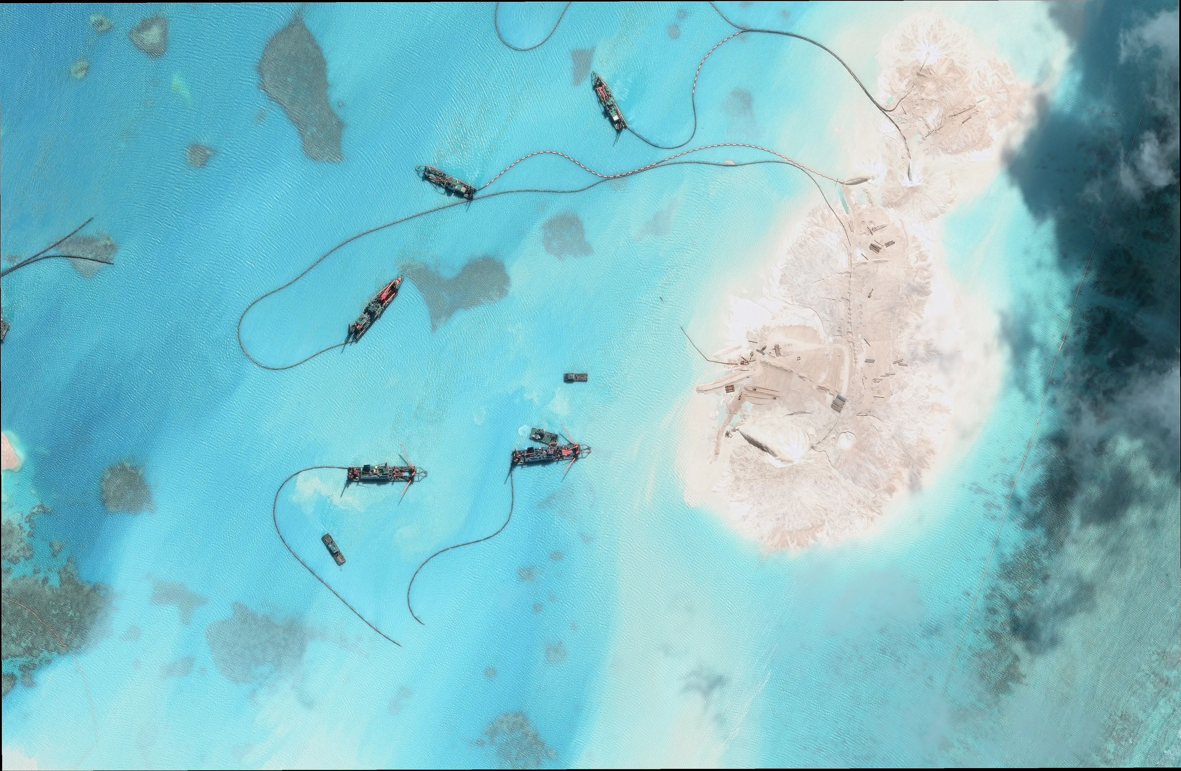 This activity at the reef appears to have already created several square kilometres of new land, with significant reclamation visible across more than 15 square kilometres of the once-empty reef.