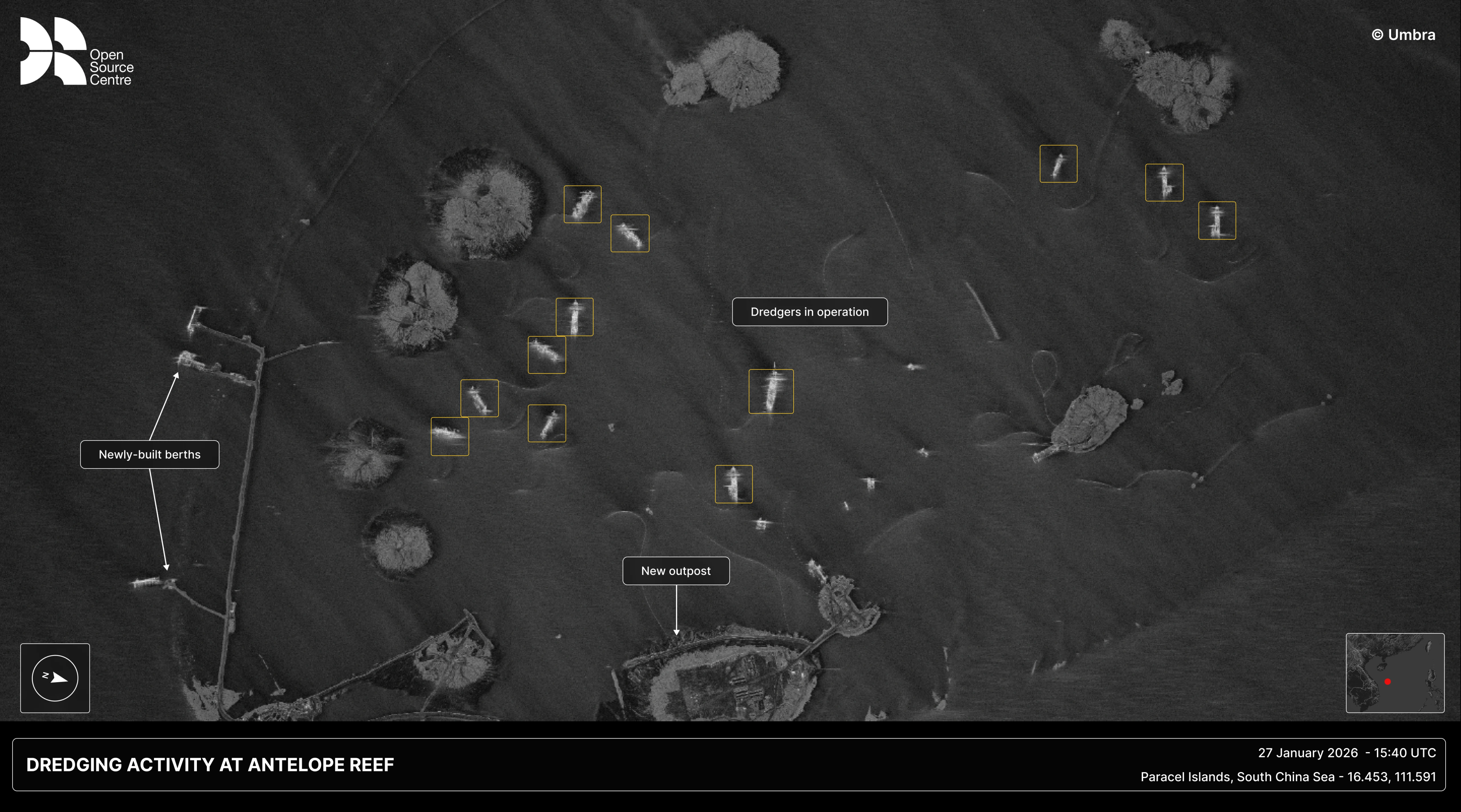 OSC identified several China-flagged vessels at Antelope Reef, likely operated by dredging subsidiaries of the U.S.-sanctioned China Communications Construction Company (CCCC). As a primary instrument of Beijing’s maritime strategy, the state-owned CCCC has spearheaded land reclamation and militarisation projects in the region that have stoked growing tensions with China’s neighbours.