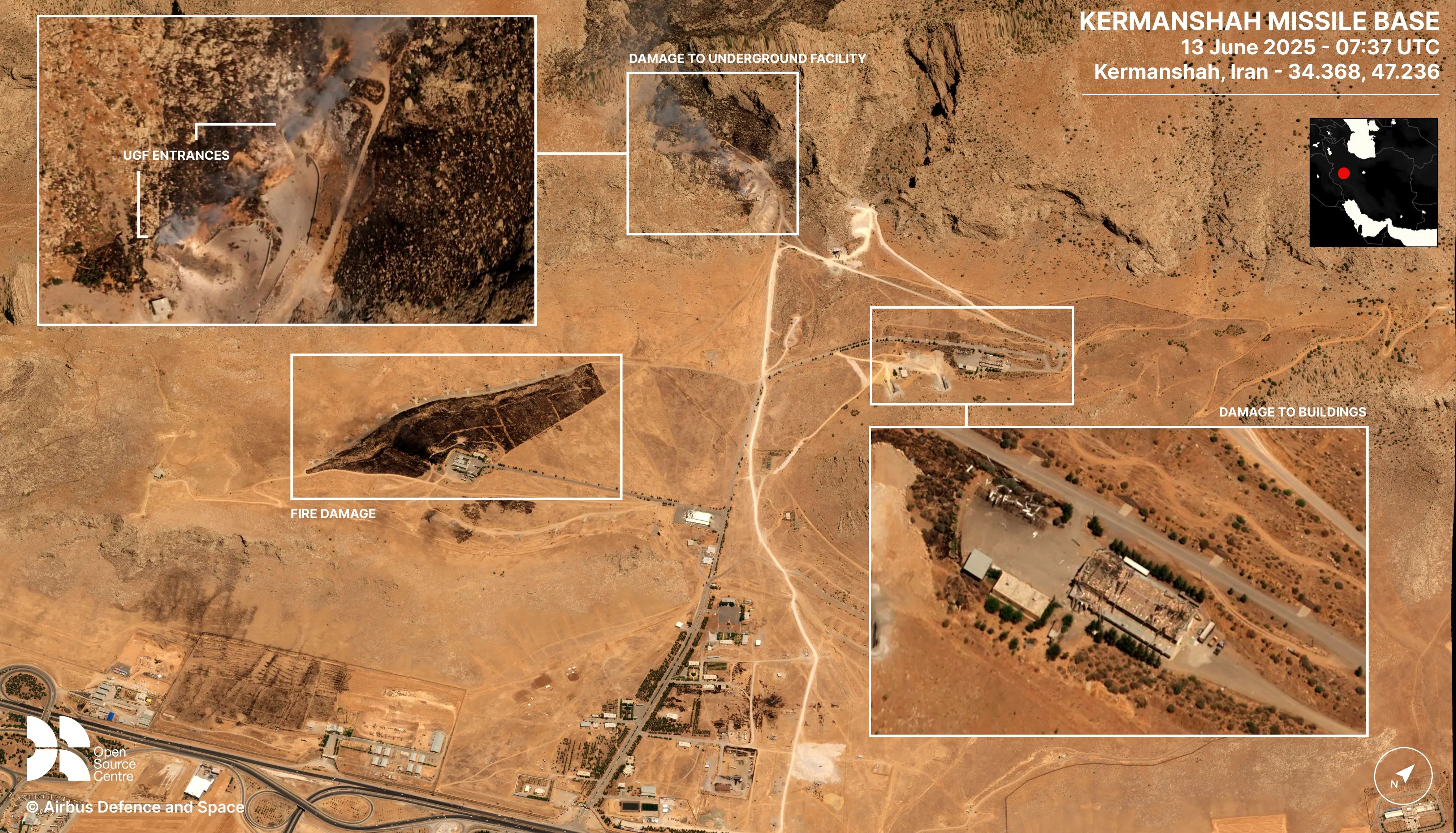 High-resolution images of two missile facilities at Kermanshah and Bid Kaneh show Israel targeted a range of buildings at both sites, including the entrances to underground structures at the Kermanshah missile base.