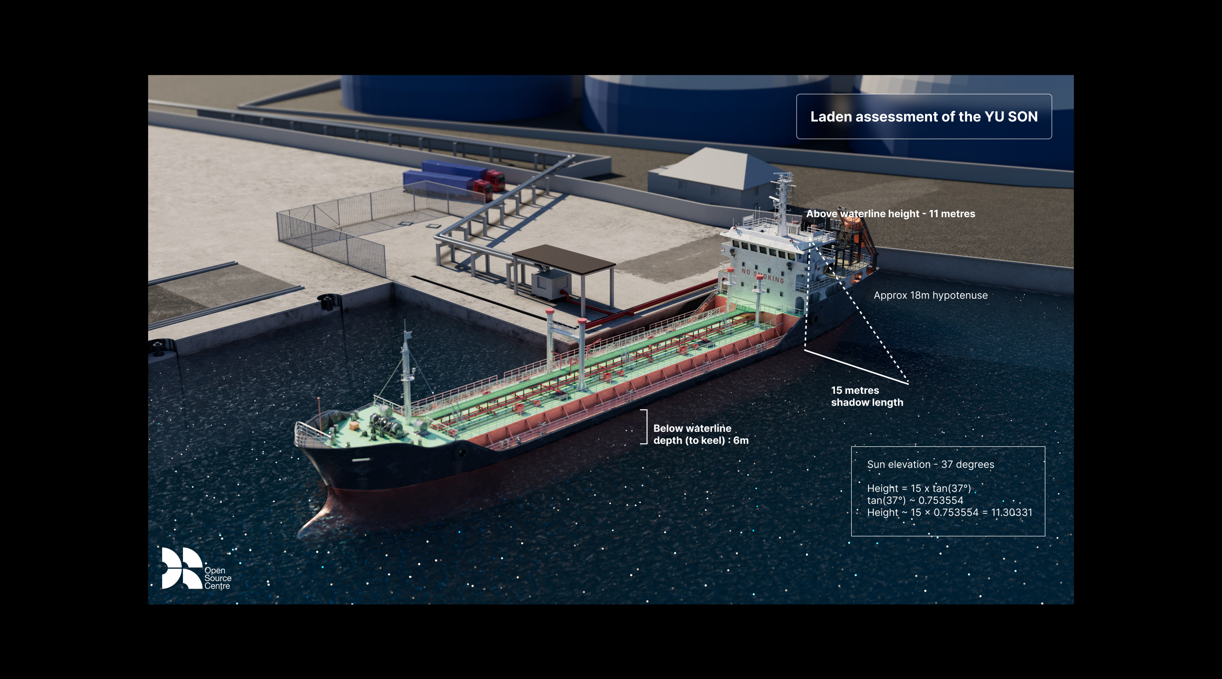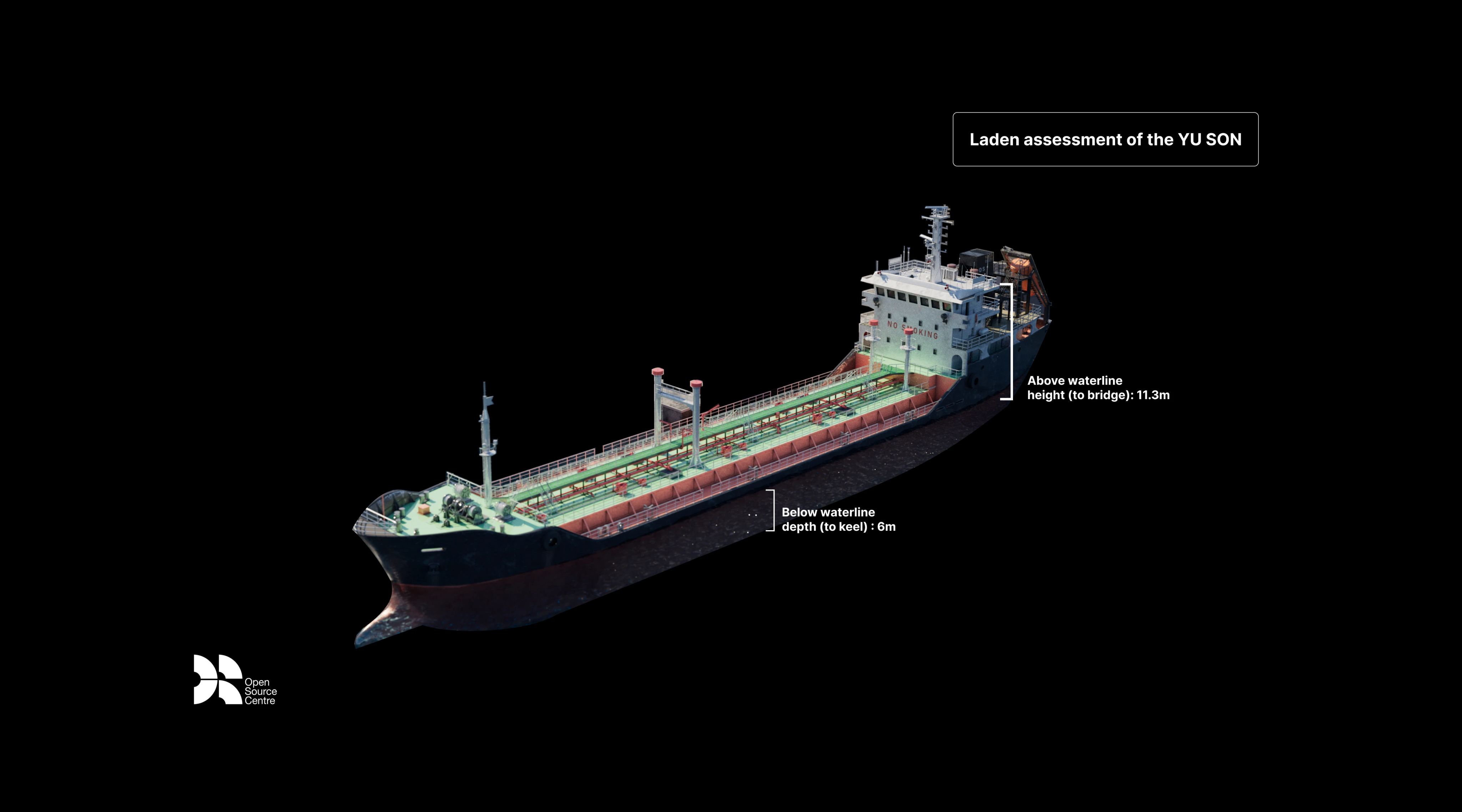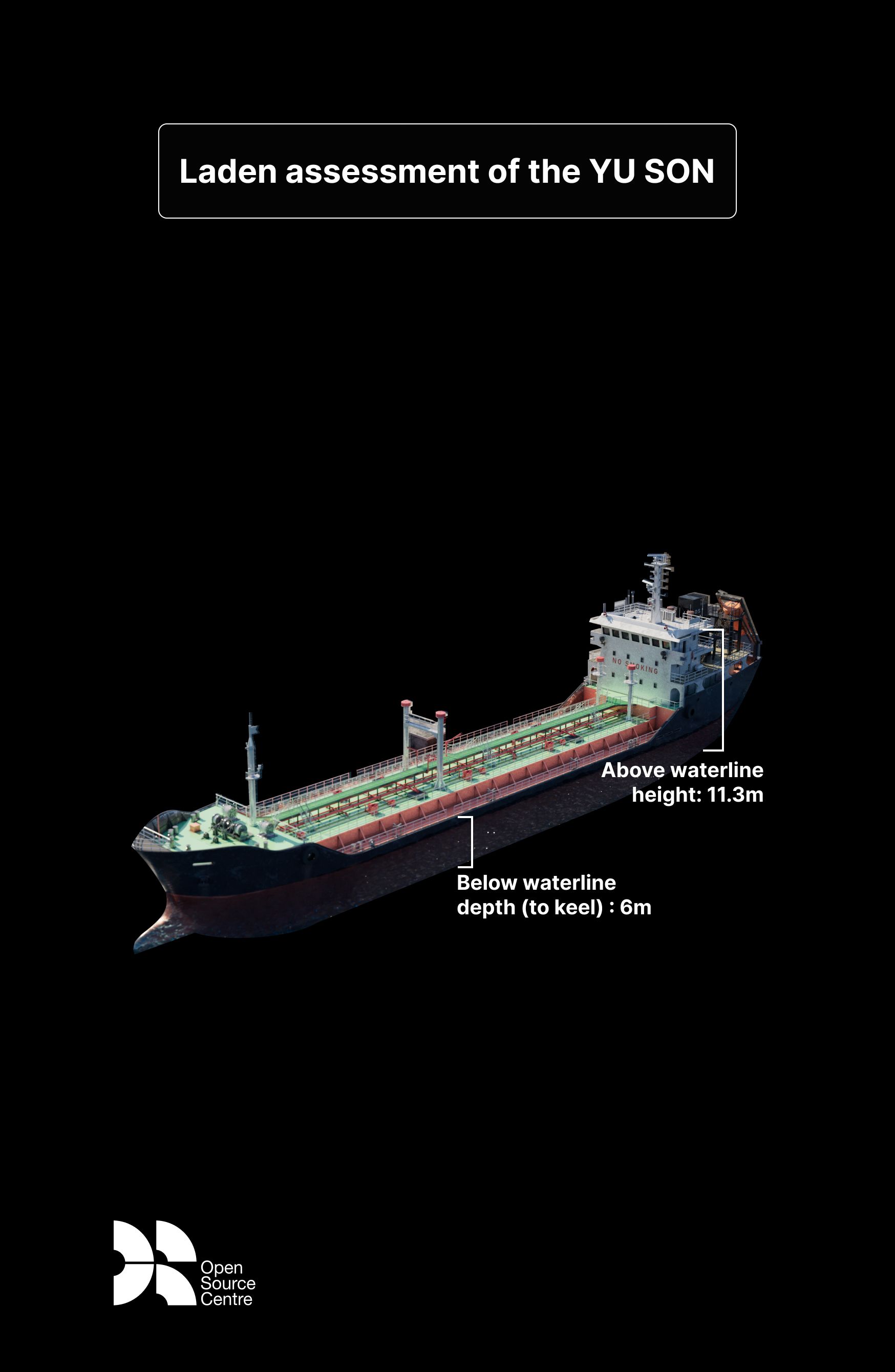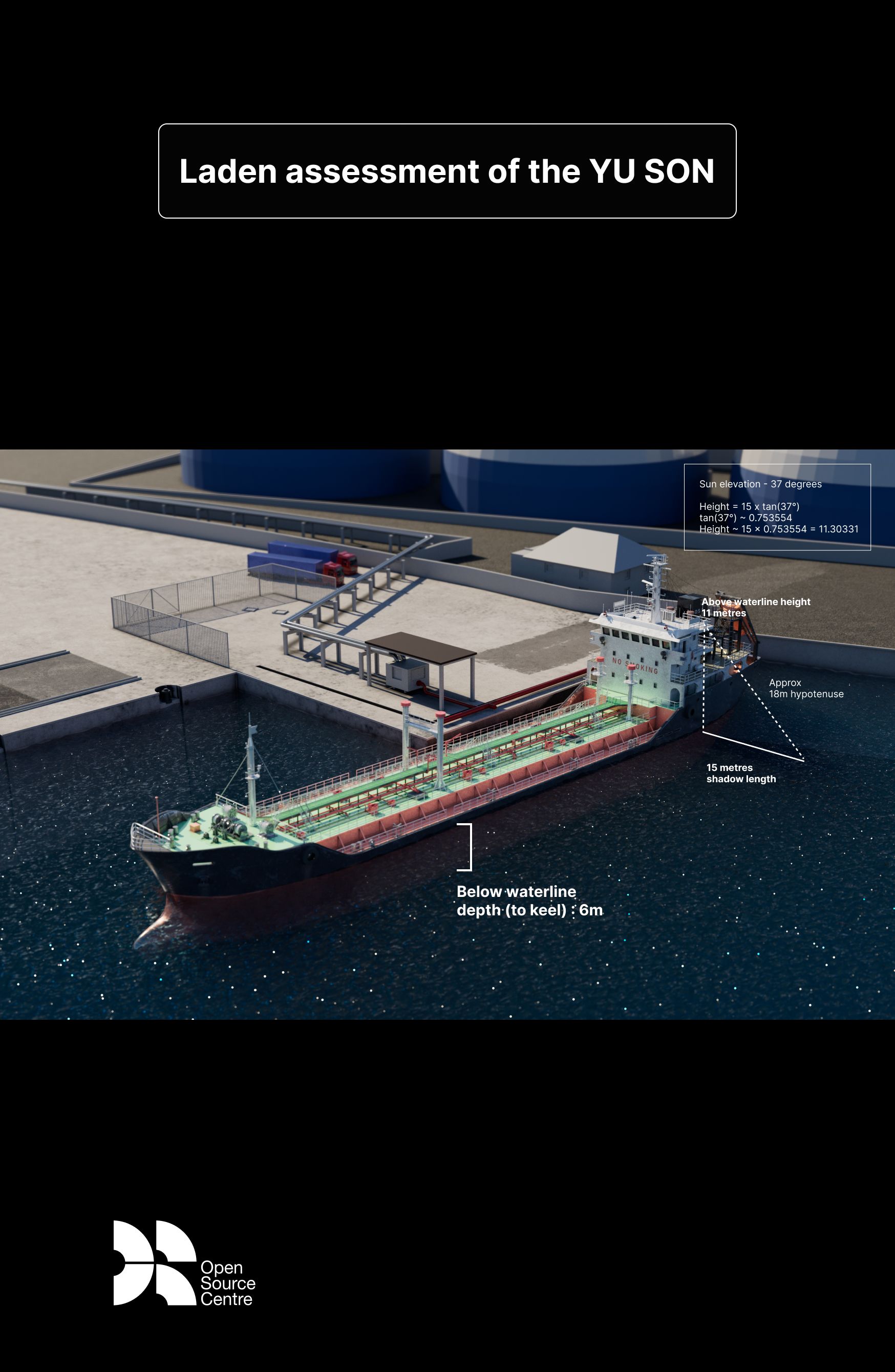 By combining the data from the digital model with the observed sun elevation, shadow lengths and the metadata from the satellite sensor, the resulting 3D analysis shows that in five of the six satellite images of the Yu Son in Russian and North Korean waters, it was undeniably, heavily laden with oil.
