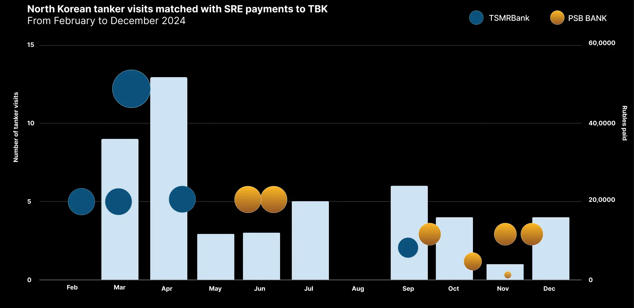 The largest transaction took place on 29 March 2024. The following month, 13 North Korean tankers visited the port. In August 2024, during a lull in payments, OSC did not identify a single shipment in high-resolution imagery. Across all the other months in which North Korean tankers visited to load oil, SRE made payments to TBK.